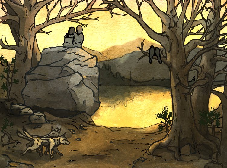 Back in June I finished up the comic I had been working on for roughly six months. The idea was to create a comic that couldn't be translated to print and to present a story that pushed the boundaries storytelling. When I was developing the story for the project, my committee member Matt Kaufhold, a scriptwriter told me that my story needed a beginning, middle, and end. This advice got me thinking, what if I didn't have the three basic parts of a story? I made a comic that was structured as circles (thus defying normal page logic) There is no page, just an unlimited canvas. Obviously I was heavily influenced by Scott McCloud's writings on the future of comics. This unlimited space allowed the story to take on a format that moves a story in ways we are not used to. For example, the comic is technically linear but you can enter into the comic at any point. At several points the story branches in two directions, not in the way a choose your own adventure novel branches, the story actually continues both paths (regardless the path the reader chooses), the reader can choose which character he or she would like to follow. Since the essential story is circular, the reader will eventually come back to that point in the story and can choose the other direction to get a wider understanding of the story.